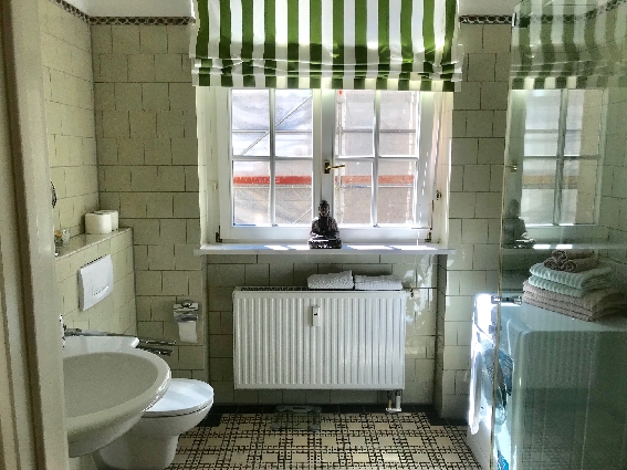 Das Bad hat eine Glasdusche und eine Waschmaschine + Trockner.