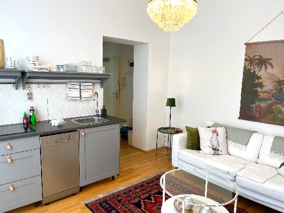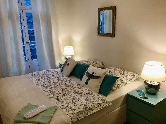 Das Apartment SPA hat ca 60 qm mit kleinem Schlafzimmer (Doppelbett 180x200) und ein Wohnzimmer mit Küchenzeile