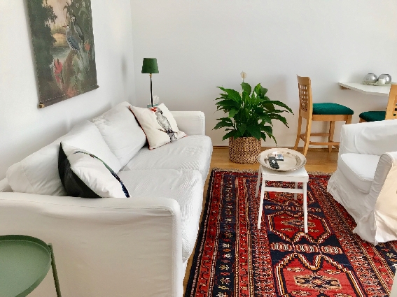 Im Wohnzimmer steht neben Couch und smart TV auch ein kleiner Schreib/ Esstisch.